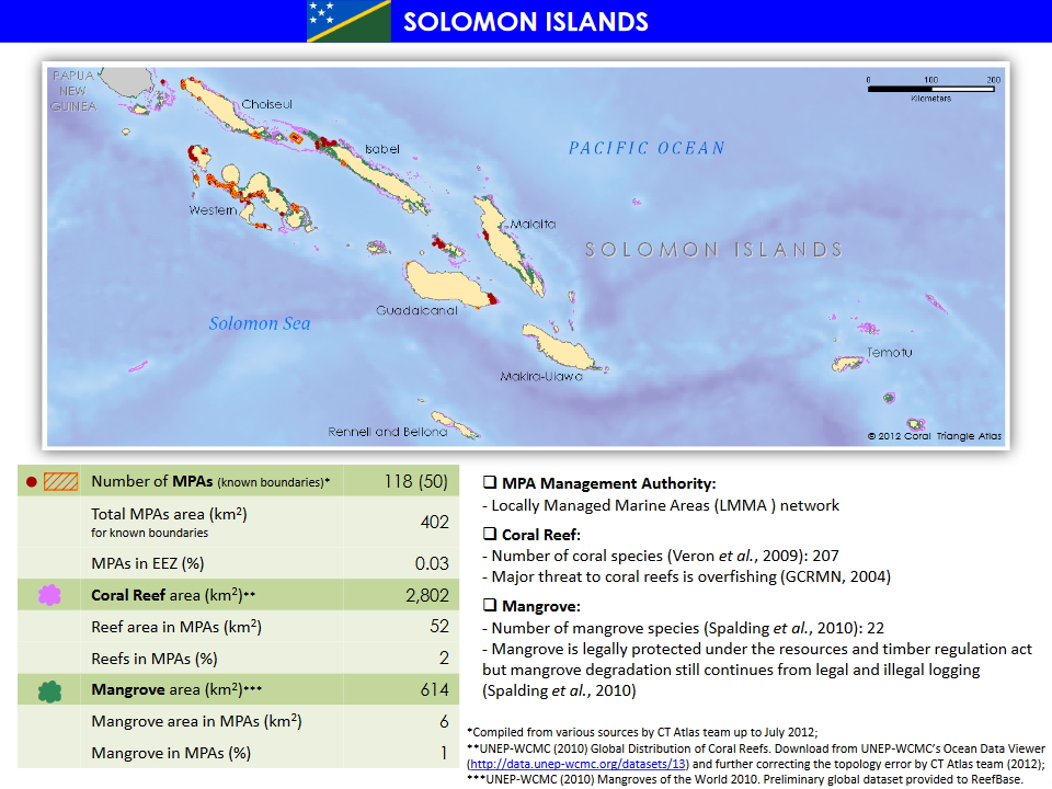 Solomon Islanders, like their neighbors in Papua New Guinea, have a long history of managing their resources at the community level. Traditional ownership - wherein land and sea tenure is held by clans - prevails across the nation's numerous islands. As such, the primary method for marine conservation in the Solomon Islands is through Locally Managed Marine Areas (LMMAs). While the LMMAs of Solomon Islands are generally on the small side compared to other countries in the Coral Triangle, they are effective in maintaining benefits for local communities.